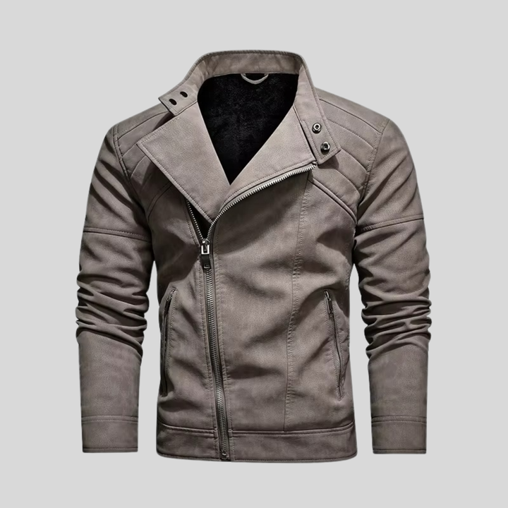 The Lawson. A moto jacket with asymmetric zip closure. Notch lapel collar with snap details. Diagonal zip front. Zippered side pockets. Quilted panels on shoulders. Distressed brown finish. Slim fit through the body. Built for spring and autumn.