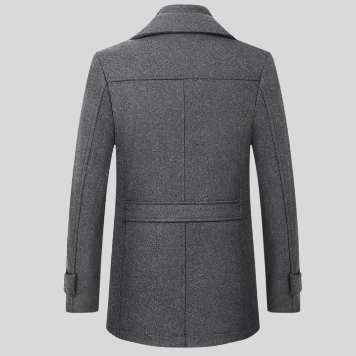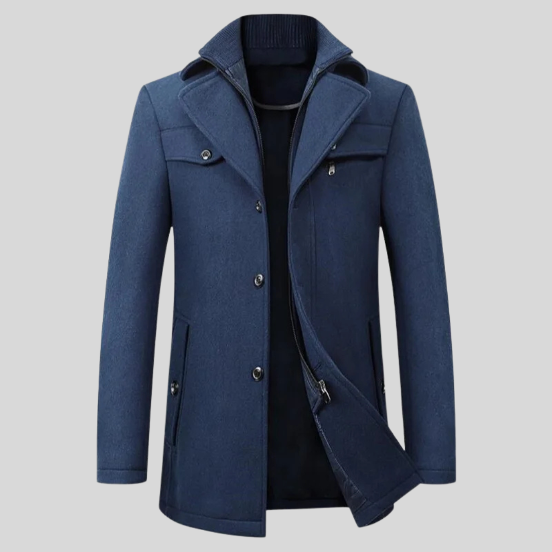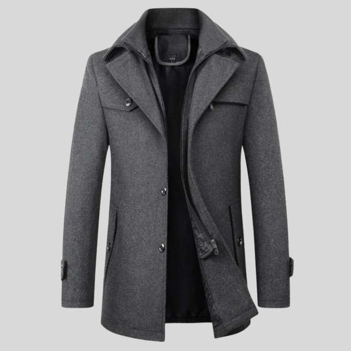 Features include a full-zip interior layer, notch lapels, four functional pockets, and adjustable cuff tabs. The mid-thigh length and tailored fit work equally well over a suit or weekend wear.