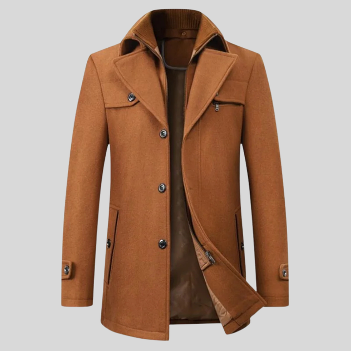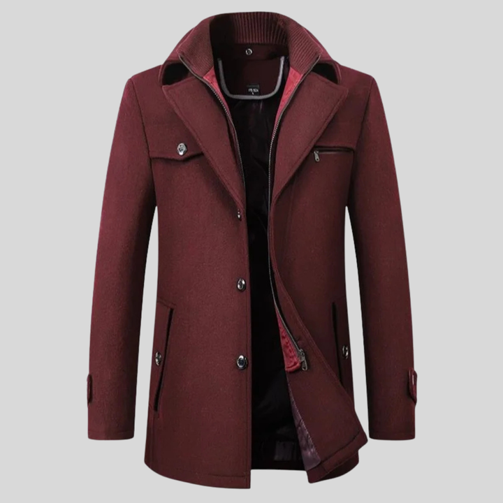 A modern wool coat built on classic lines. Cut from a premium wool blend in a clean, single-breasted silhouette with a removable knit collar for versatility across seasons.