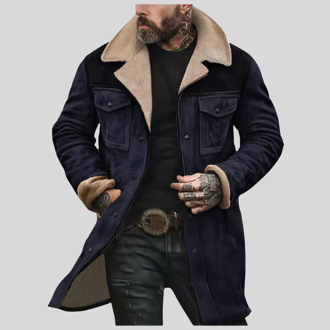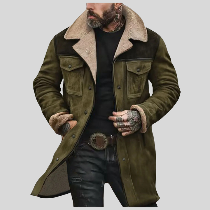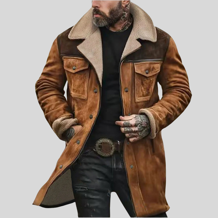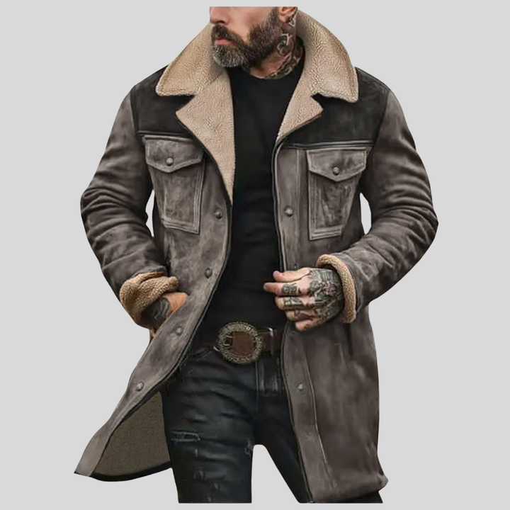 A heavyweight shearling-lined leather coat built for the long haul. Crafted from premium suede and leather with genuine shearling collar and cuffs, this coat features dual chest pockets, snap-button closure, and a length that hits just below the hip. Designed to age beautifully and stand up to whatever winter throws at you.