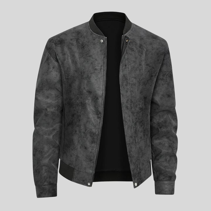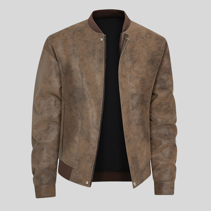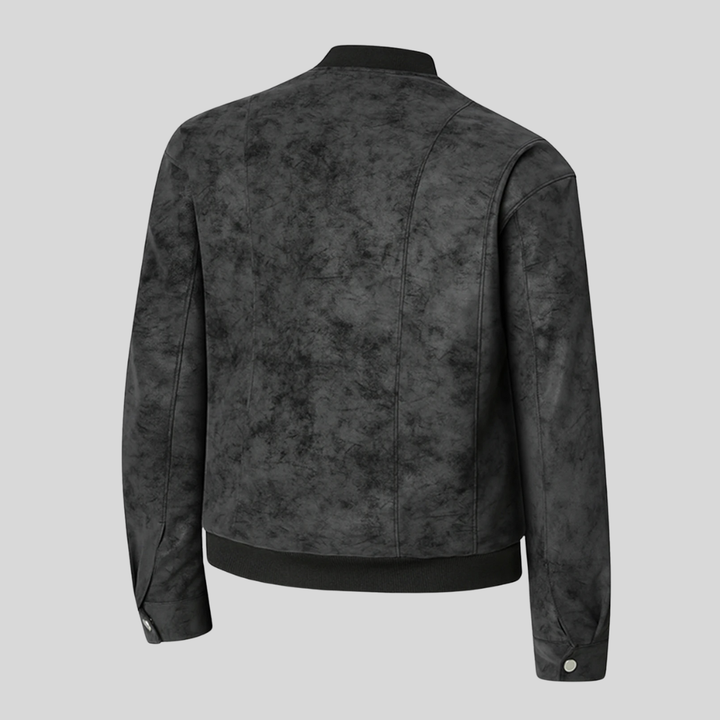 The Reeves Bomber. A modern take on the classic moto silhouette. Crafted from distressed PU leather with a lived-in finish that only gets better with wear. Ribbed knit collar, cuffs, and hem provide structure and comfort. Full zip front with snap placket for a clean closure. Relaxed fit layers easily over tees and henleys. Polyester lined for smooth wear.