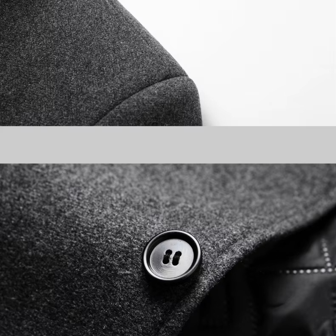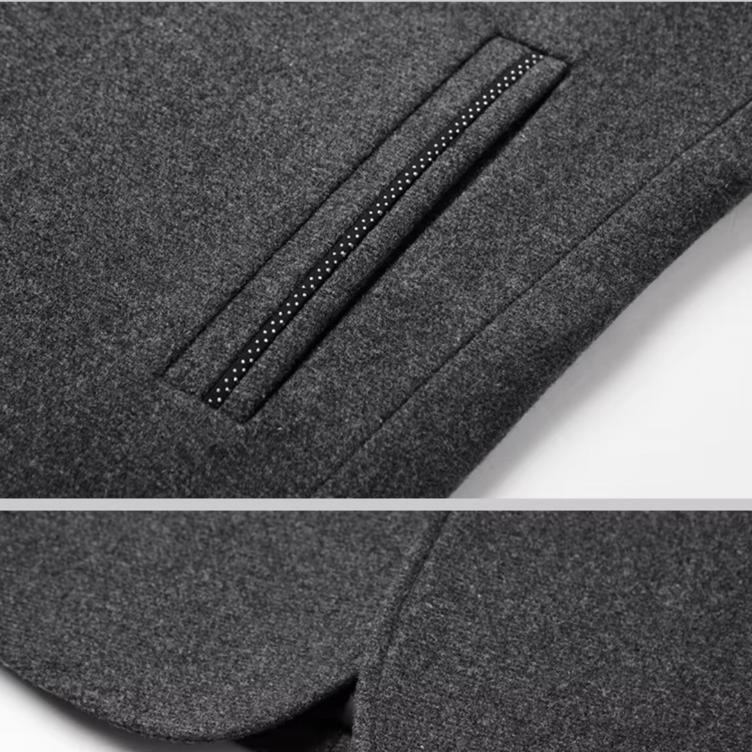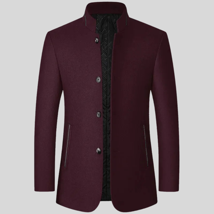 A modern jacket with a clean band collar and button-front closure. Cut from a wool-polyester blend for durability and warmth. Features a quilted interior lining for added comfort and refined detail. Slanted welt pockets, tailored fit through the body, and a hip-length cut that works over dress shirts or sweaters. The band collar adds a modern edge to classic tailoring. Built for the office, the commute, and everything in between.