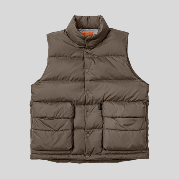 A quilted puffer vest with a stand collar and snap-front closure. Features two large flap pockets at the chest for storage. Built with lightweight insulation for core warmth without restricting movement.